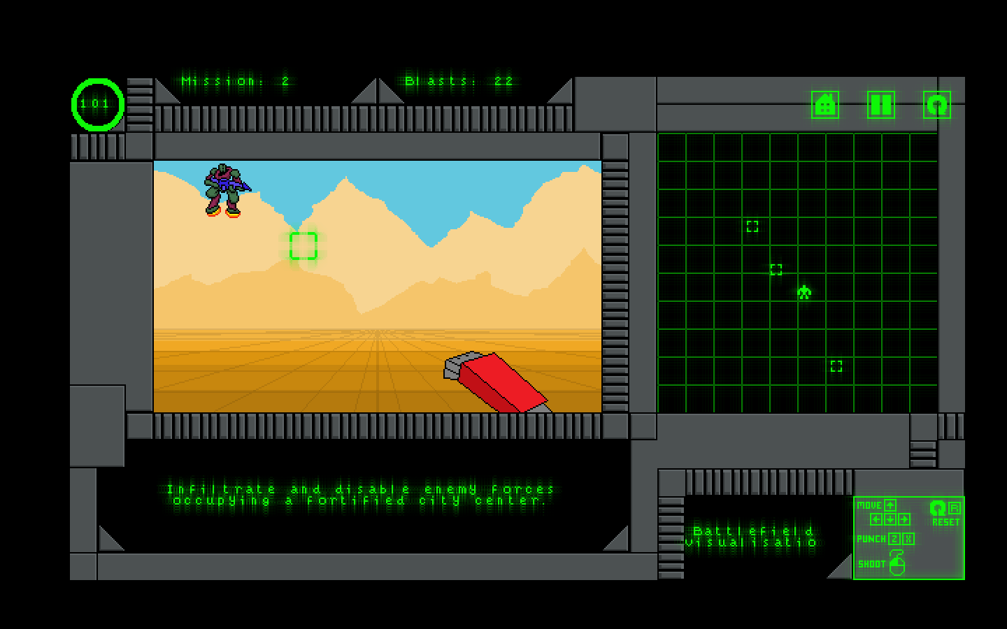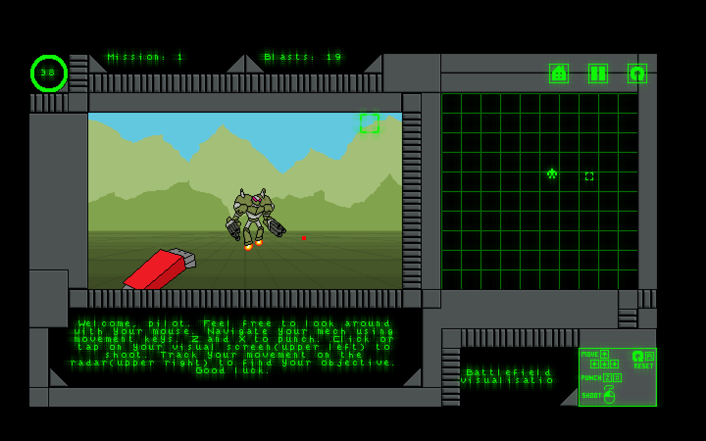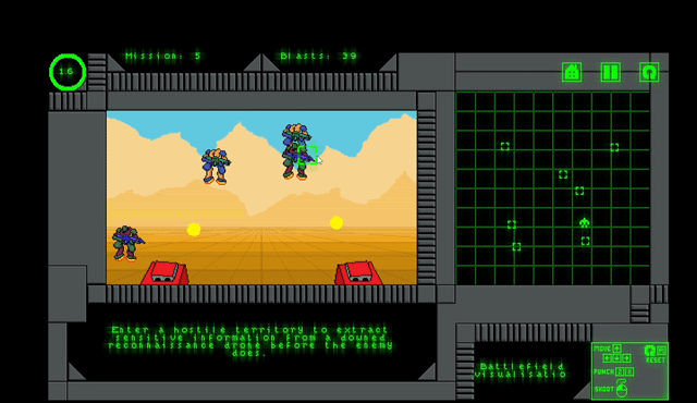 Complete missions spanning different themes like military ops, exploration, rescue, intrigue, combat, diplomacy, survival, and mystery. Use you rewards of successful completion to repair or upgrade different parts of your mech. Carefully analyze your position, manage resources and strategize in this mech piloting action simulator!